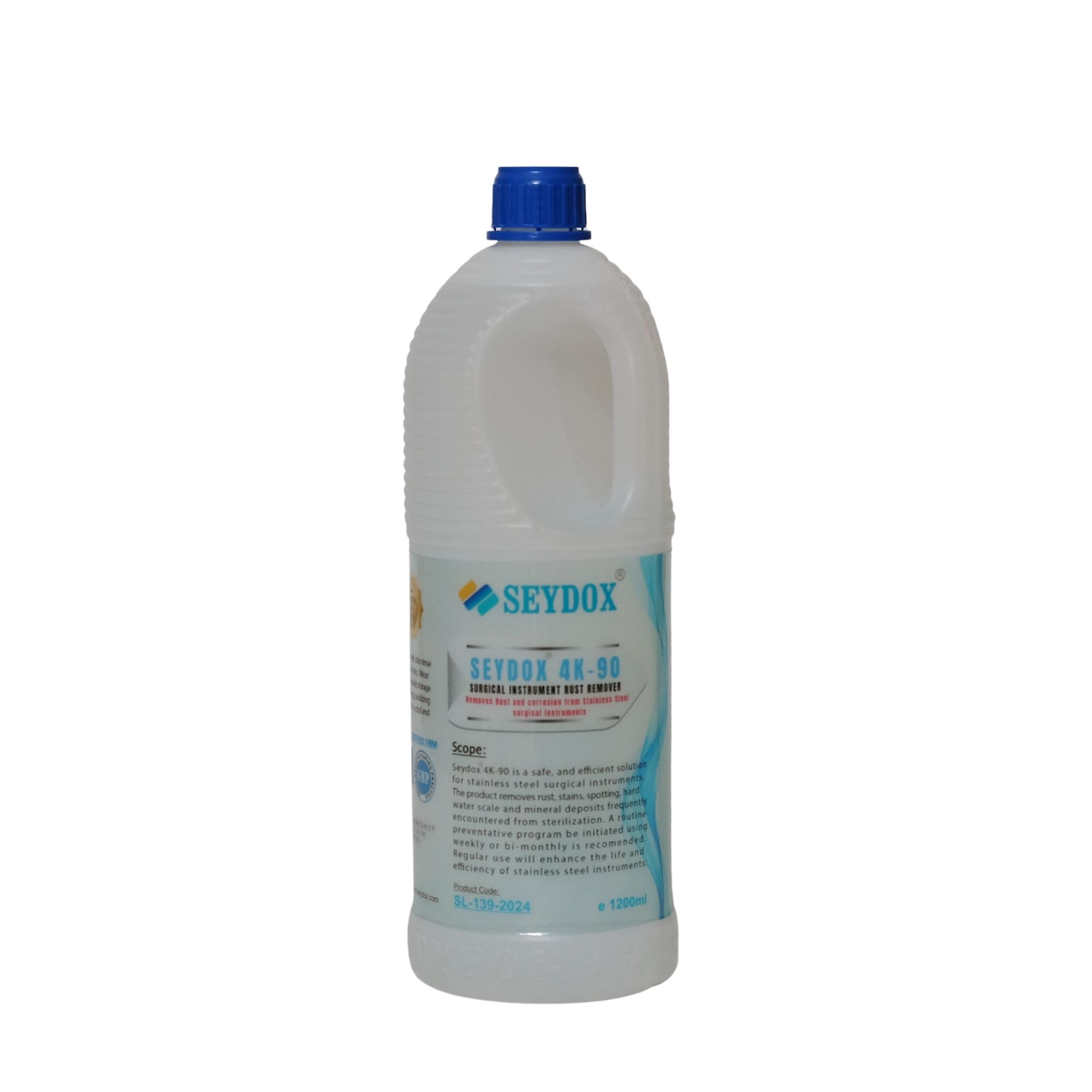 Seydox 4K-90 is a safe and efficient solution for stainless steel surgical instruments. It effectively removes rust, stains, spotting, hard water scale, and mineral deposits commonly resulting from repeated sterilization.